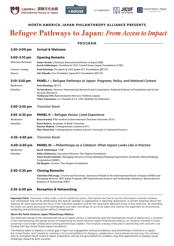 On April 8, JICUF co-organized a symposium titled “Refugee Pathways to Japan: From Access to Impact” at the International House of Japan (IHJ) in Tokyo. JICUF staff worked closely with IHJ, the American Friends of the International House of Japan (AFIHJ) and the United States-Japan Foundation (USJF) to plan and implement this event. The goal was to raise awareness about the current state of the admission of refugees to Japan through educational and employment opportunities, and contemplate the role of philanthropy in this space.