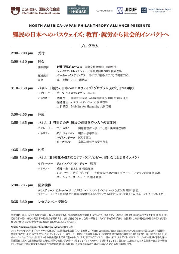 4月8日、JICUFは東京の国際文化会館(IHJ)において、「難民の日本へのパスウェイズ:アクセスからインパクトへ」と題するシンポジウムを共催しました。本イベントの企画・実施にあたり、JICUFのスタッフはIHJ、American Friends of the International House of Japan (AFIHJ)、および米日財団(USJF)と緊密に連携しました。本シンポジウムの目的は、教育および就労の機会を通じた日本への難民の受け入れの現状について認識を高めるとともに、この分野におけるフィランソロピーの役割について考察することでした。